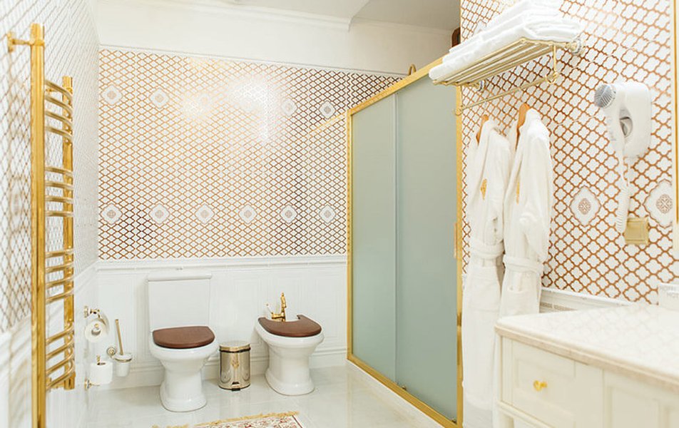 Санузел: джакузи, ванна, душевая кабина или ванна, раковина, унитаз, фен, тапочки, туалетные принадлежности