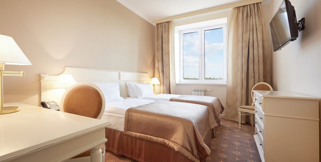 В номере: две односпальные кровати, прикроватные тумбочки, стол, стулья, шкаф, кондиционер, мини-холодильник, сейф, телевизор ЖК, телефон, чайный набор посуды