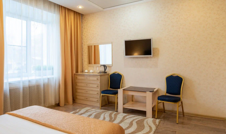 В номере: вешалка, зеркало, кровать двуспальная, прикроватные тумбочки, стол, стулья, шкаф, телевизор, холодильник, чайник