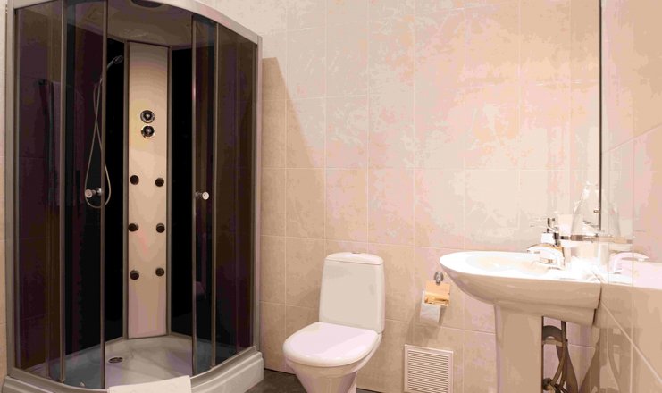 Санузел: с душевой кабиной, тапочки, туалетные принадлежности, фен, халат